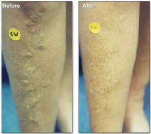 With EVLT, one 3mm incision is made on the inside of the knee and a tiny laser fiber is placed inside the vein up to the groin. Clients walk immediately after treatment and wear a bandage and stocking for 1 week.