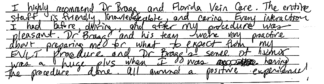 “I highly recommend Dr. Bragg and Florida Vein Care. The entire staff is friendly, knowledgeable and caring. Every interaction I had before, during , and after my procedure was pleasant. Dr. Bragg and his team were very proactive about preparing me for what to expect from my EVLT procedure and Dr. Bragg’s sense of humor was huge plus when I was having the procedure done. All around a positive experience!